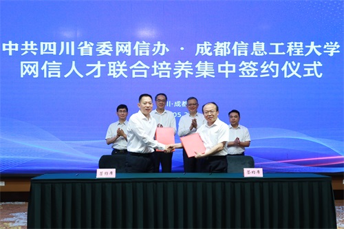 【本网讯】5月20日上午,四川省委网信办在新华宾馆举行网信人才联合培养集中签约仪式,分别与我校及四川大学、四川师范大学三所高校签订合作框架协议,省网络治理研究中心、成都铁路运输第一法院(成都互联网法庭)与四川师范大学法学院签订三方合作协议,共同推动网信领域人才培养、学科建设、创新研究、学术交流、产教融合等方面的合作。我校校长余敏明、副校长何建新,教务处负责人应邀出席活动,余敏明在仪式上致辞。