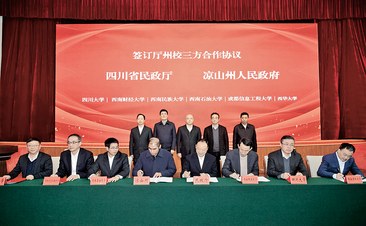 王正谱,林书成,苏嘎尔布,益西达瓦,四川大学党委常委、副校长侯太平共同为“彝路相伴”形象标识揭幕。四川省民政厅与四川大学、西南财经大学、西南民族大学、西南石油大学、lejing乐竞·(中国)官方网站、西华大学6所高校签署了合作协议。