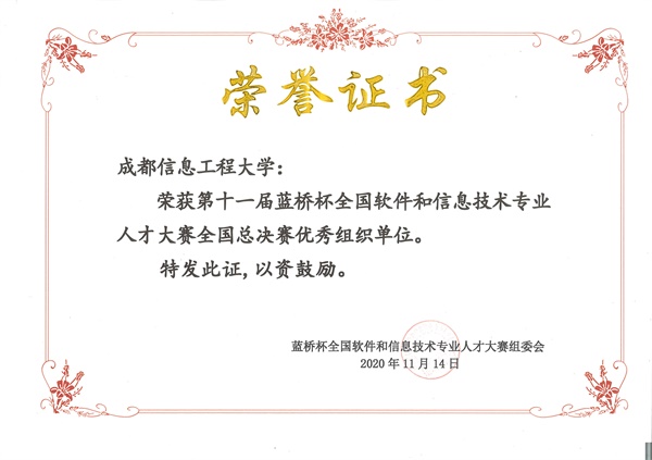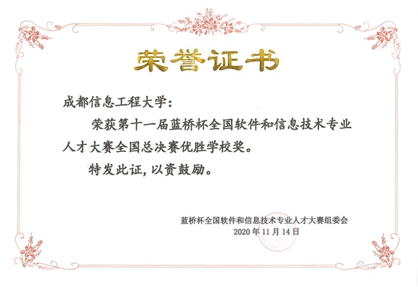【本网讯】第十一届“蓝桥杯”全国软件和信息技术专业人才大赛全国总决赛于近日落下帷幕。全国31个省市自治区1200多所高校的 6 万余名选手报名参加了个人赛的角逐。我校今年共有74名选手以省赛一等奖的成绩进入全国总决赛,创历史新高。其中通信工程学院罗震获得“嵌入式设计与开发”大学组全国一等奖,我校其他决赛选手获得全国二等奖28项,全国三等奖30项。在前期的省赛角逐阶段,我校另获得省二等奖70项,省三等奖44项。同时,学校获得了本次大赛“优胜学校奖”和“优秀组织单位”的称号。
