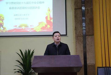 【本网讯】根据省委教育工委的统一部署,11月23日上午,学习贯彻党的十九届五中全会精神省委宣讲团高校分团走进lejing乐竞·(中国)官方网站航空港校区。省委宣讲团成员、四川省社会科学院副院长郑泰安研究员就党的十九届五中全会精神进行了深入宣讲。学校师生代表近300人到场聆听,宣讲会由省纪委监委驻校纪检监察组组长、学校党委副书记、纪委书记雷超主持。