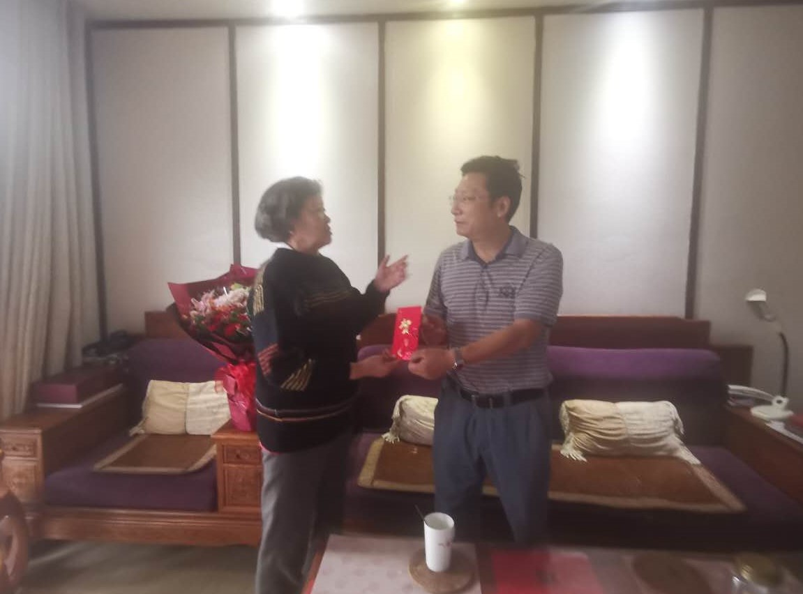 马洪江向离退休教师送上节日的鲜花和慰问金,并致以诚挚的问候和美好的祝福。他仔细询问了老师们的身体状况和生活起居情况,了解了疫情期间老同志的日常生活和防护情况,感谢老师们对学校的辛勤付出和积极贡献。他说,正是老师们的无私付出,才为学校的发展奠定了坚实基础,祝愿全校离退休教师节日快乐、身体健康、阖家幸福。老师们对学校的关怀关心深表感谢,祝愿学校不断发展,蒸蒸日上。