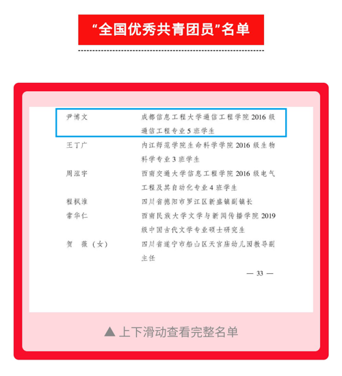 【本网讯】为表彰先进,宣传先进,激励全国团员、团干部和各级团组织奋发有为、再创佳绩,近日,根据共青团中央《关于表彰“全国优秀共青团员”“全国优秀共青团干部”“全国五四红旗团委(团支部)”的决定》,我校通信工程学院通信工程专业2016级5班学生尹博文荣获“全国优秀共青团员”称号。