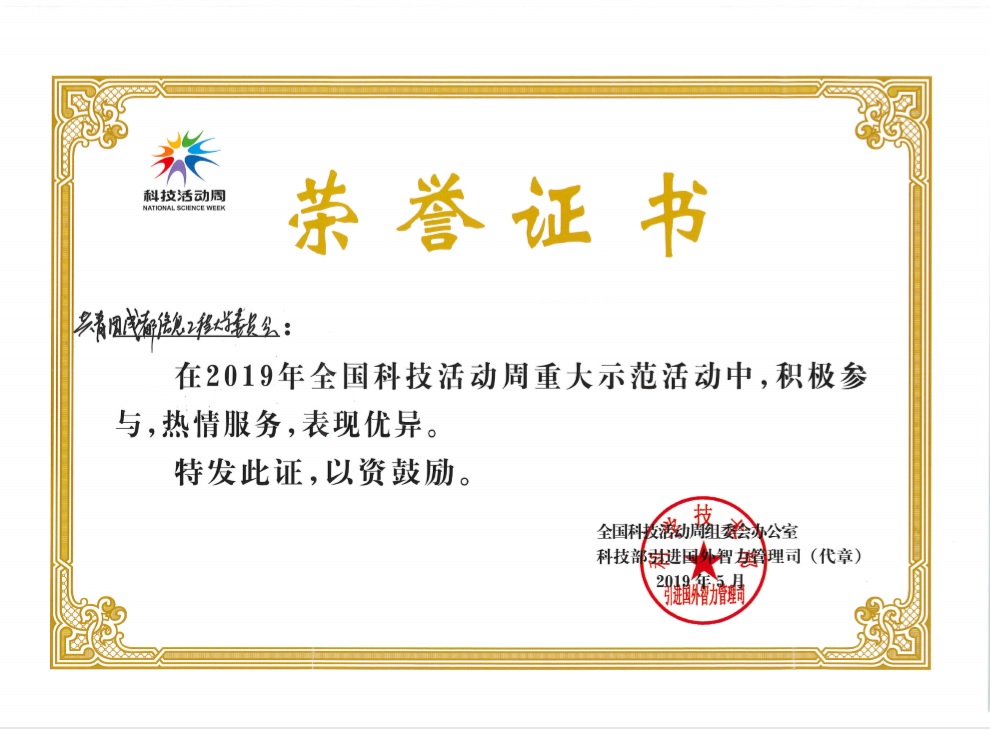 【本网讯】近日,学校承办的2019年全国科技活动周重大示范活动全国气象科普讲解大赛,得到了中国气象局、中国气象学会和广大参赛嘉宾和选手的赞誉。学校团委作为校内承办单位,因积极参与、表现优异,获得全国科技活动周组委会办公室和科技部引进国外智力管理司联合表彰。
