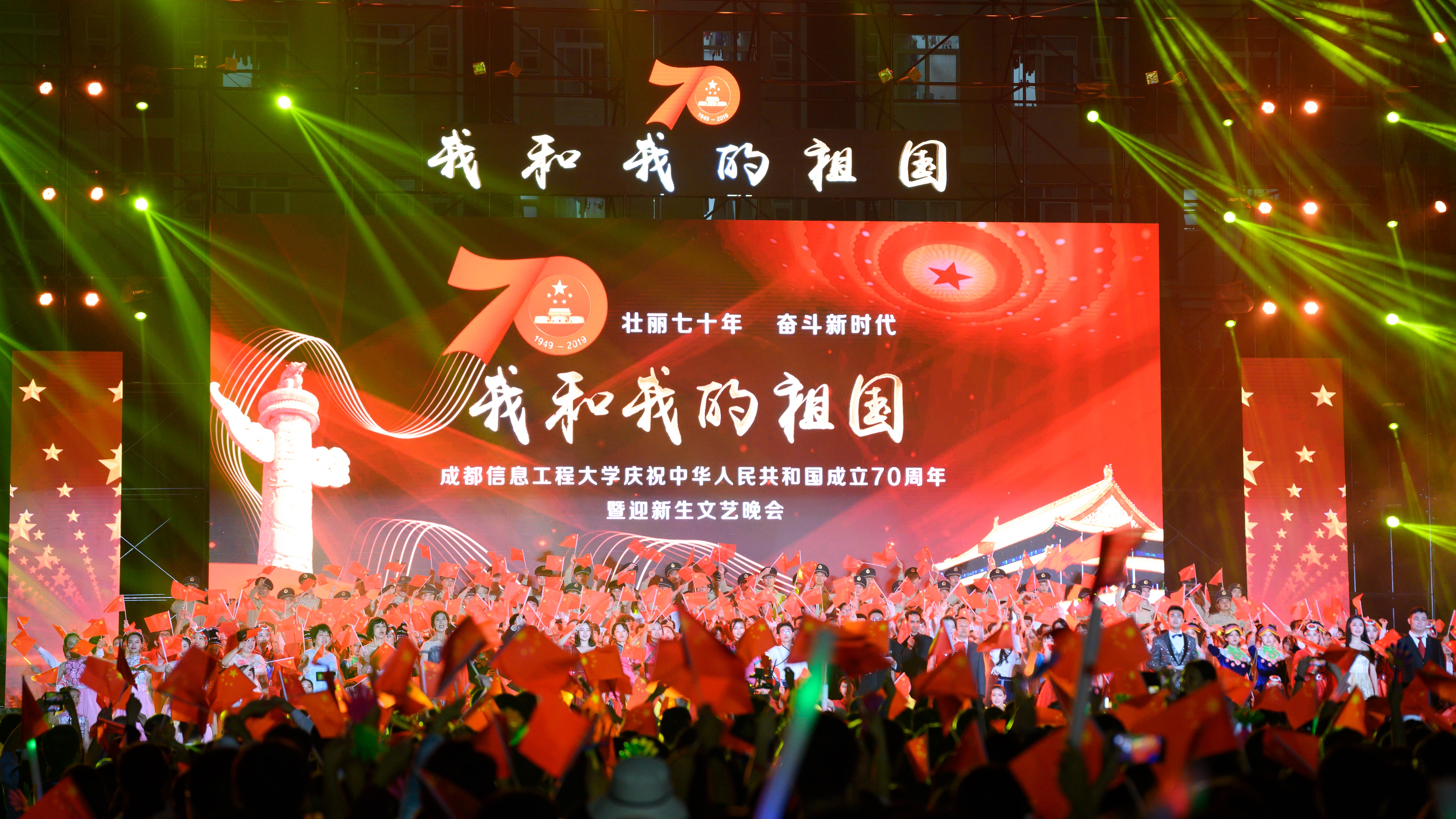 20米长的五星红旗在万人间传递将晚会推向了最高潮,全体师生共唱《我和我的祖国》,祝福伟大的祖国繁荣昌盛,祝愿成信人携手并进,再谱华章。师生们热情地挥动手中的国旗,共庆新中国70华诞,晚会在《歌唱祖国》中圆满结束。