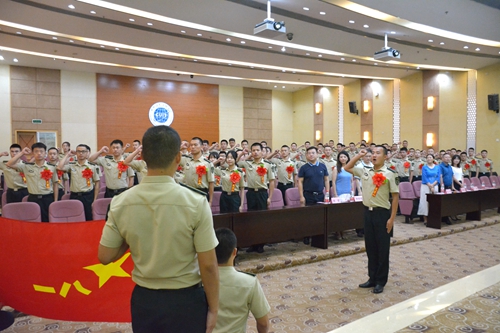 全体毕业年级国防生面向军旗庄严宣誓,服从中国共产党的领导,全心全意为人民服务,服从命令,忠于职守,严守纪律,保守秘密,英勇顽强,不怕牺牲,苦练杀敌本领,时刻准备战斗,绝不叛离军队,誓死保卫祖国。