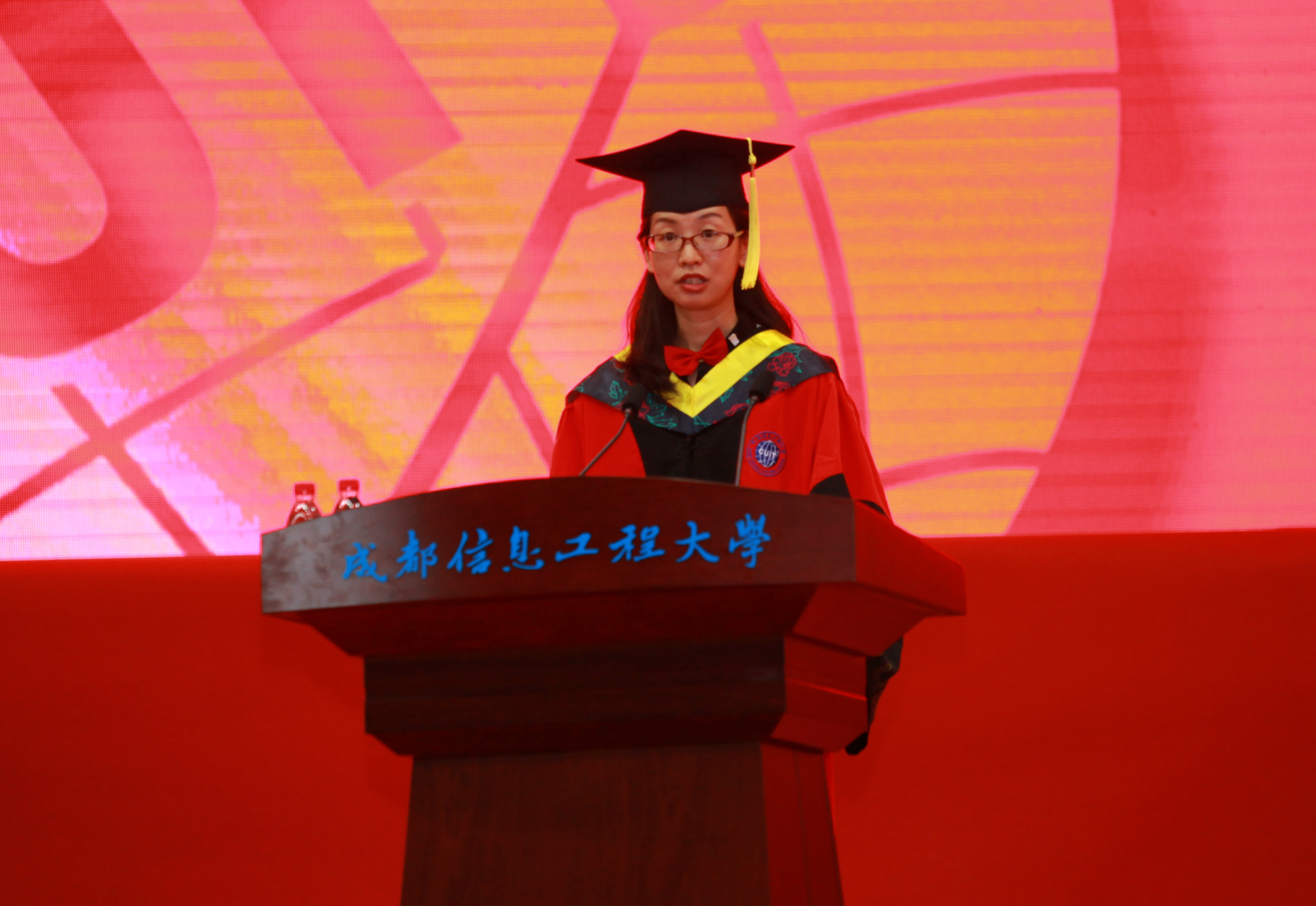 学校四川校友会会长、“思华助学基金”创始人、成都尊华投资(集团)有限公司董事长邓思华代表校友发言。他祝贺毕业生们完成了一段重要的人生历程,和毕业生一起重温了自己三十年前就读成信大(时为成都气象学院)的青春岁月,分享了自己就业、创业的心得体会。他希望毕业生在追逐梦想的过程中,学会感恩,珍惜当下;目标清晰,坚守初心;听从内心,顺应时代,努力创造无愧于时代、无愧于自己的精彩人生。
