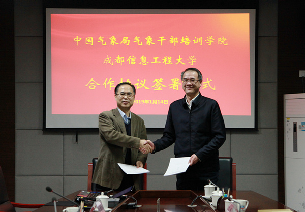 【本网讯】为进一步落实《中国气象局关于深化局校合作工作的意见》精神,推动气象科研与教育培训工作融合发展,1月14日,学校与中国气象局气象干部培训学院签署合作协议。学校校长余敏明与气象干部培训学院党委书记、院长、局党校常务副校长王怀刚代表双方签约。学校副校长舒红平、科技处处长朱明参加签约仪式。