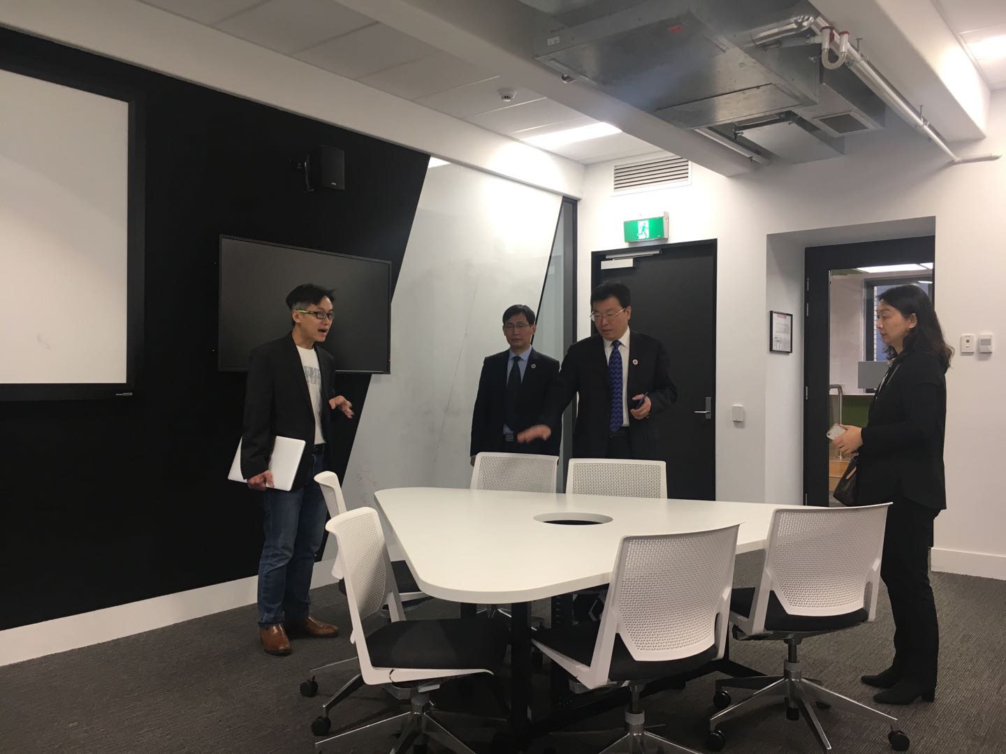 代表团访问澳大利亚塔斯马尼亚大学,与人机界面实验室(HITLab)教授比昂·康进行了深入交流,针对虚拟现实驾驶模拟系统研制、多种人机交互输入和反馈技术、老年人行为计算机建模与仿真等科研方向进行了深入探讨。双方希望能够实现更多的突破和尽快开展相关领域的科研合作。