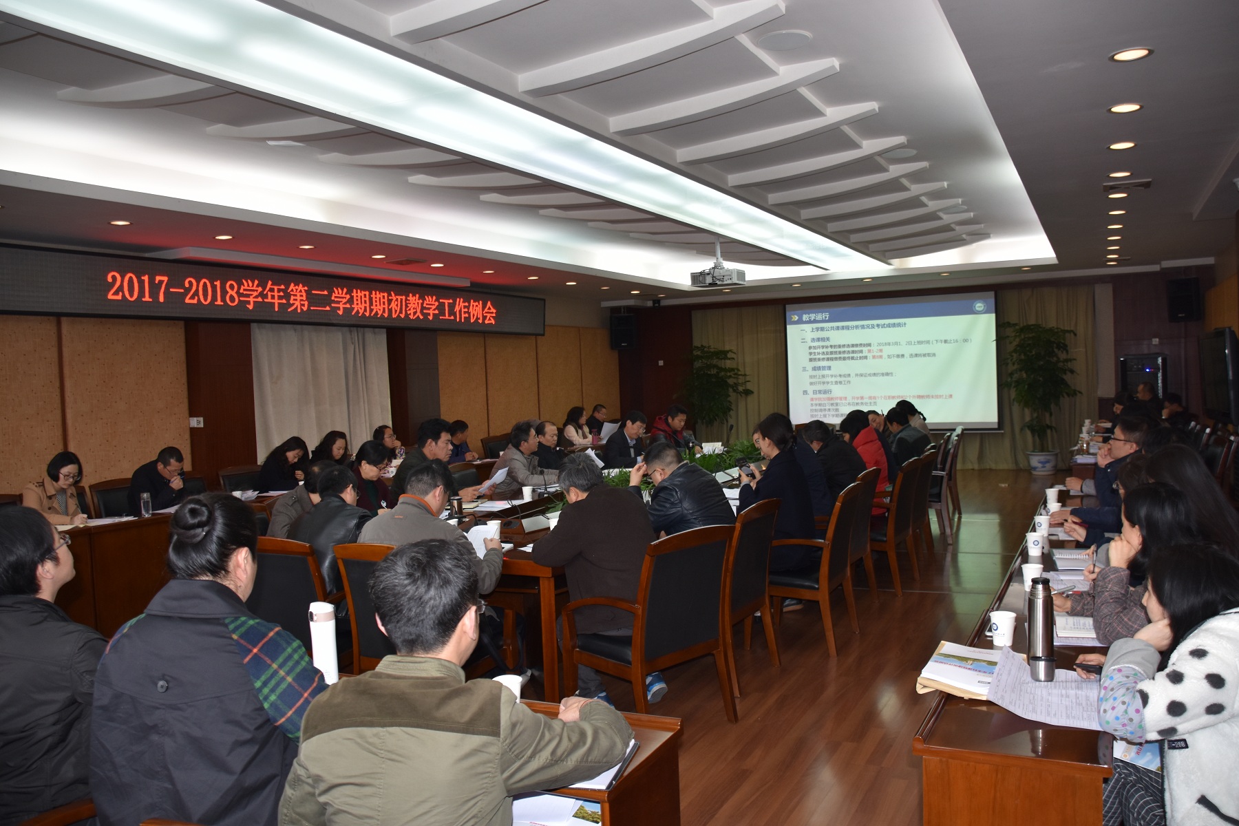 教务处副处长杜通平、易平分别介绍了本学期教务处常规教学工作安排,对公共基础课课程分析、成绩统计情况进行了分析,强调了本学期日常教学运行、学籍管理、实践教学、创新创业教育工作开展时间、工作任务及要求。