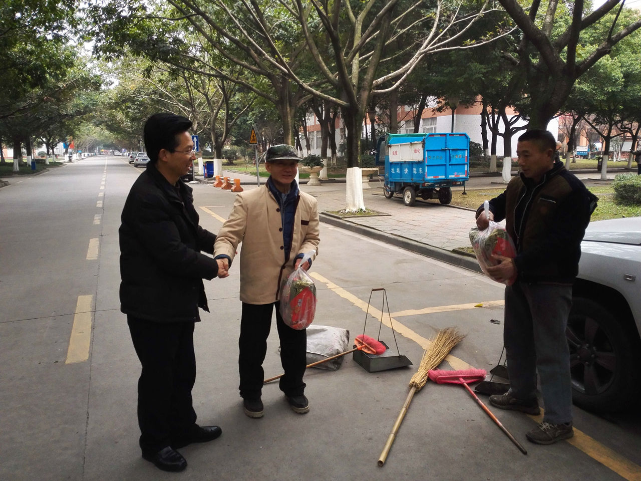 【本网讯】2月11日,在新春佳节来临之际,学校副校长于世祥、肖月强带队到航空港和龙泉校区,看望慰问寒假期间坚守在工作岗位一线的值班教职工、校卫队员、食堂师傅、宿舍管理员以及留校学生,向他们致以节日的问候和新春祝福,并送去了精心准备的新年慰问品。学生工作处、保卫处、后勤管理处、后勤公司的负责人和相关学院党总支书记参加慰问。