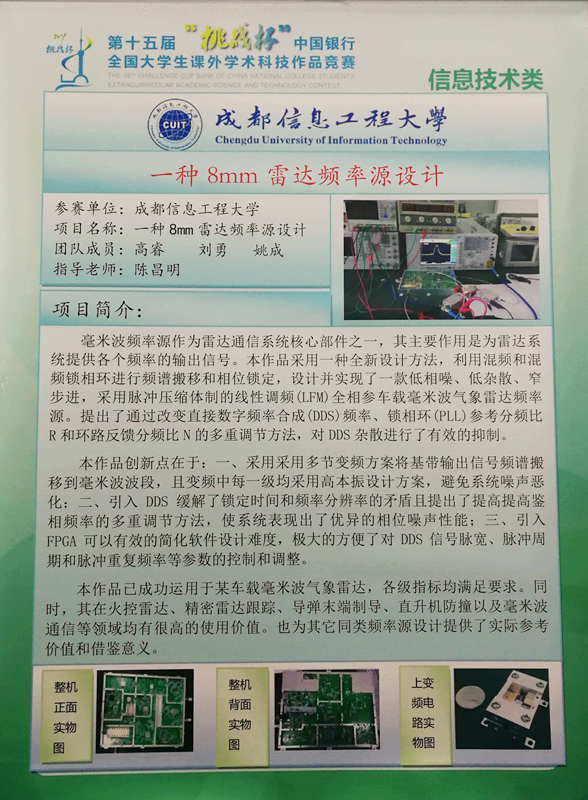 【本网讯】11月14日至19日,由共青团中央、中国科协、教育部、中国社会科学院、全国学联和上海市政府主办,上海大学承办的第十五届“挑战杯”全国大学生课外学术科技作品竞赛终审决赛在上海大学宝山校区举行。我校由通信工程学院陈昌明教授指导,高睿团队的作品《一种8mm雷达频率源设计》项目获得全国三等奖。