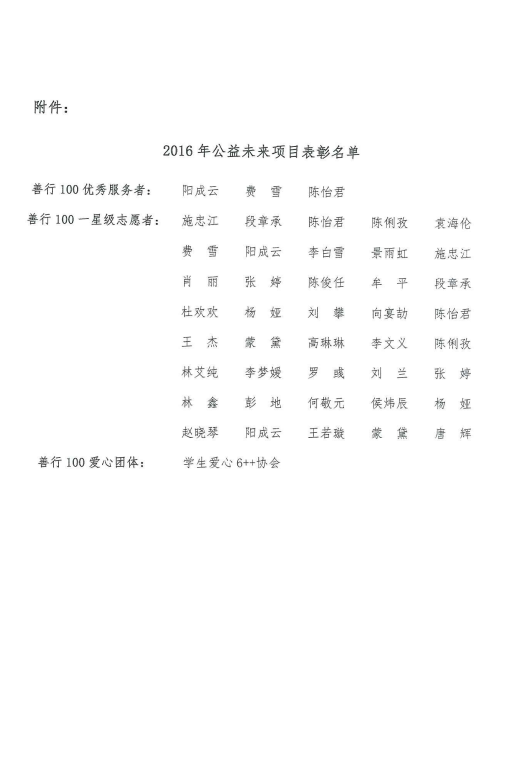 在中国扶贫基金会2016年开展的公益未来项目中,我校爱心6++协会共组织志愿者457名,累计出动3220人次,累计志愿服务超过10000小时。中国扶贫基金会授予我校爱心6++协会“爱心团体”荣誉称号,授予阳成云等3名同学“善行100优秀服务者”,授予施忠江等40名志愿者一星级“星级志愿者”荣誉称号。