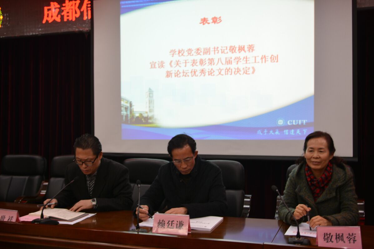 敬枫蓉宣读了《lejing乐竞·(中国)官方网站关于表彰第八届学生工作创新论坛优秀论文的决定》。我校2015年第八届学生工作创新论坛共收到36篇论文,论文主题广泛、涉及面广,密切关注学生工作中的新现象、新情况,并提出了新的解决方案。大会对刘全等撰写的《基于大数据的我国人才市场对高校毕业生素质能力需求的分析》等11篇获奖论文给予了表彰。