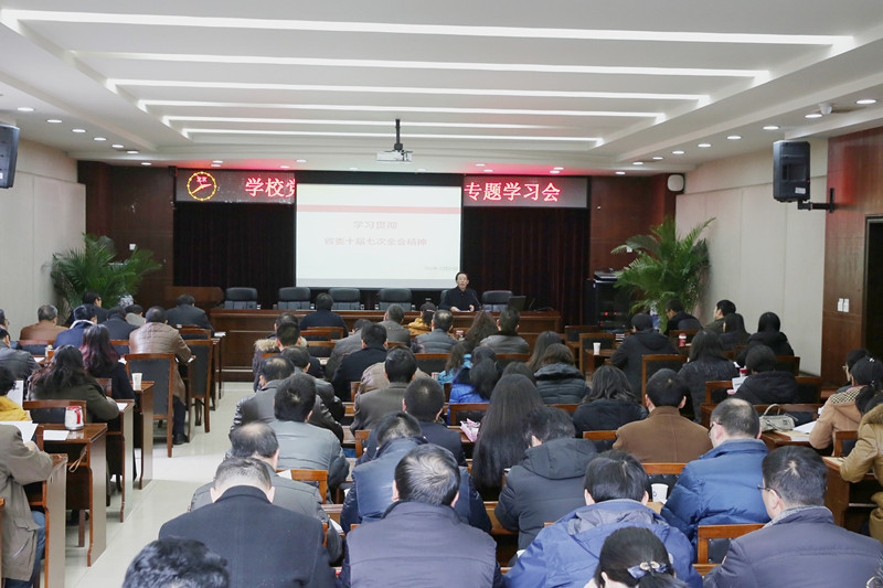 【本网讯】12月24日,学校党委中心(扩大)组在行政楼一会议室召开专题学习会,学校党委书记赖廷谦主持会议,传达学习省委十届七次全会精神,校长周激流就年终工作提出了明确要求,全体中层以上领导干部参加了会议。
