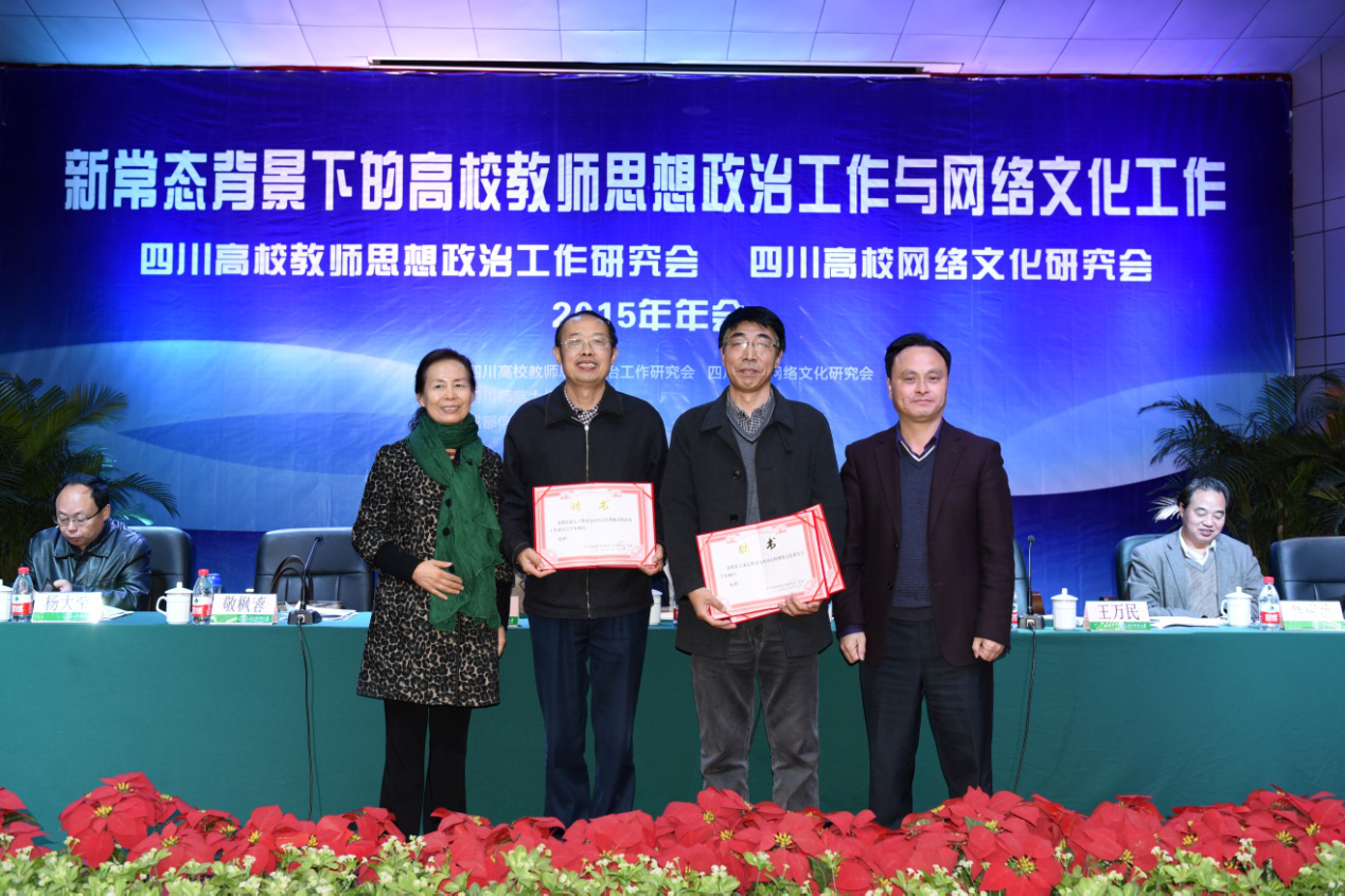 【本网讯】 11月27日,由四川师范大学主办、我校协办的四川高校教师思想政治工作研究会暨四川高校网络文化研究会2015年年会在四川师范大学狮子山校区学术报告厅召开。四川省教育厅宣传思想工作处处长陈小红,四川省社科联规划办主任黄兵,四川师范大学党委副书记唐尚朴,四川高校网络文化研究会会长、我校党委副书记敬枫蓉出席大会。全省86所高校宣传部、相关职能部门的负责人和有关方面的同志共120余人参加会议。我校宣传统战部部长饶华、副部长丁恒康,文化艺术学院教授蓝鹰参会。大会由四川高校教师思想政治工作研究会会长、四川师范大学党委副书记王万民主持。