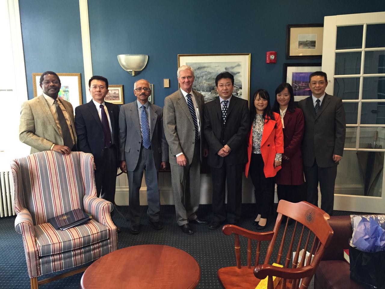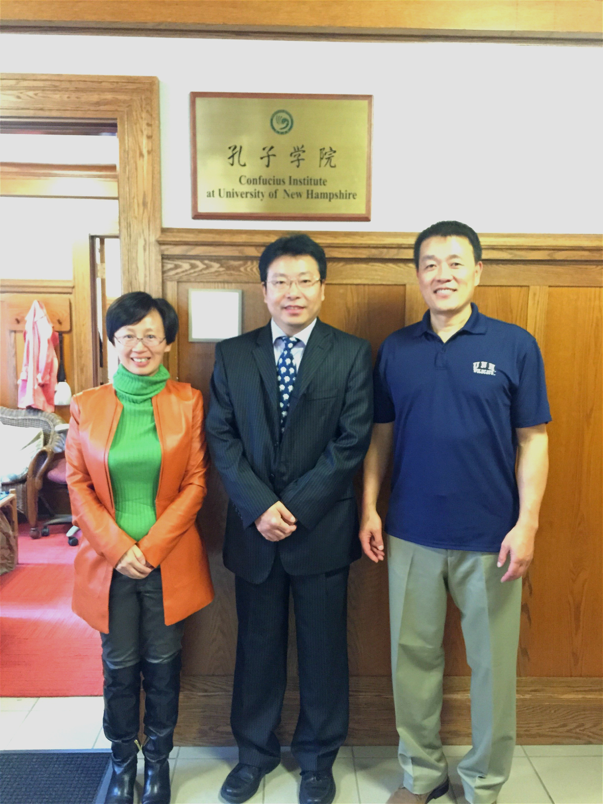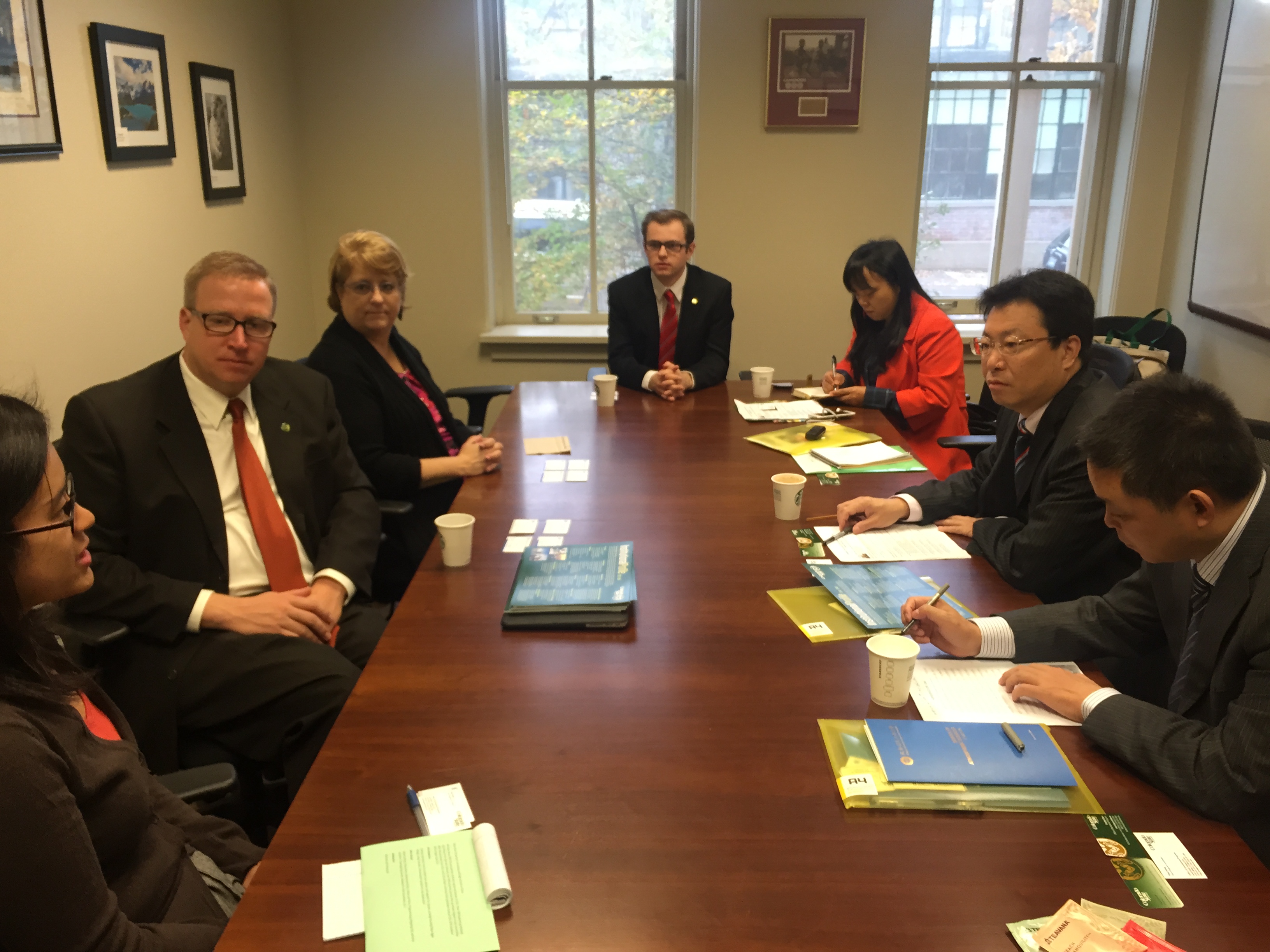 会见结束后,代表团参观了新罕布什尔孔子学院,并与新罕布什尔大学学术副校长P.T. Vasudevan、副校长Luchen Li、Marry、研究生院院长Harry Rich ards、工程和物理科学学院院长Samuel B. Mukasa以及孔子学院院长Yige Wang进行交流讨论。Samuel特别提及两校在计算机、电子工程、环境工程和大气科学(包括大气化学和水污染)方面的相似之处,希望两校相关专业的学生能相互交流,利用假期到对方学校向相关专业教授学习,进行实地考察锻炼。周激流对我校情况和学科优势做了简要介绍,并表示双方可以从本科“4+0”模式及研究生“3+x”模式开始,进一步开展更加深入广泛的合作,共享教学资源,促进两校学生交流,提高学术国际化水平。此外,双方在工程领域专业认证和知识产权专业方面,就拟合作专业学生的规模、语言水平标准以及通识教育学分互认等问题进行了细致的讨论和交流。