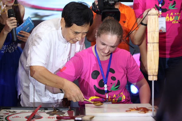 在我校的欢迎仪式上,来自我省的民俗艺术大师和我校文化艺术学院中国剪纸艺术团同学们为观众们带来了精彩纷呈的中国民间艺术表演:糖画、皮影、剪纸和泥塑,让大家饱了眼福、口福和耳福。展示了高超的技艺之后,现场的互动环节也引起了俄罗斯青年们的极大兴趣,他们兴致勃勃,或登台体验、或共同切磋,现场气氛高涨。