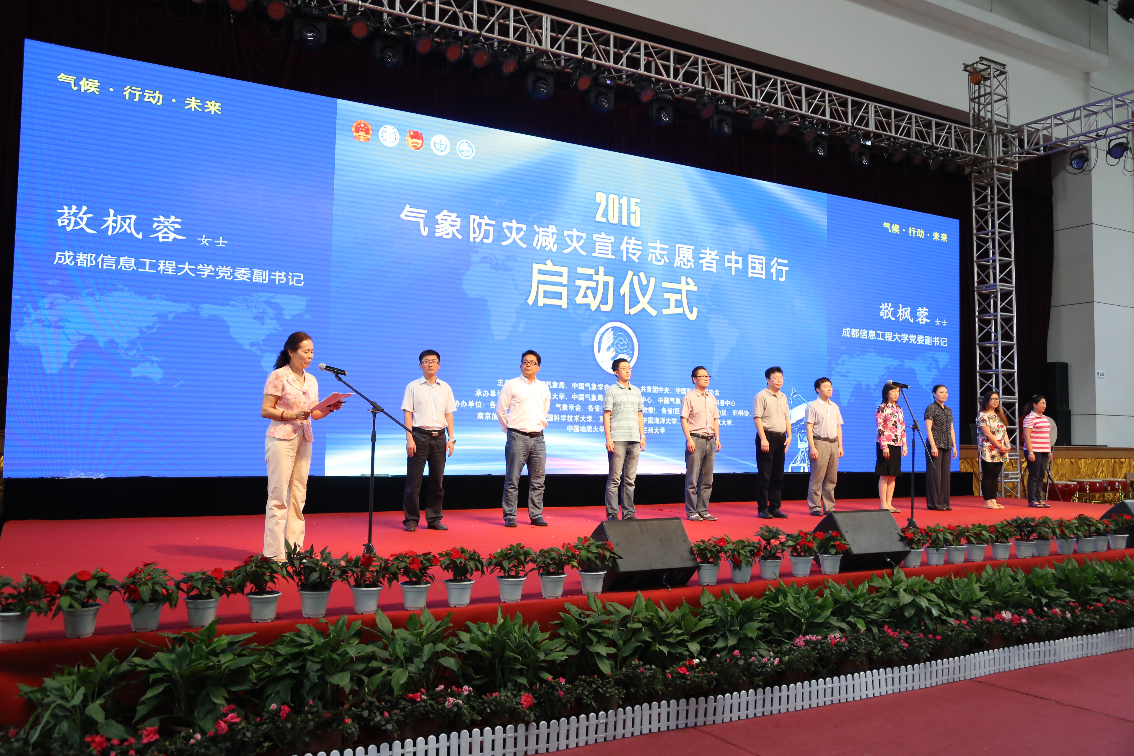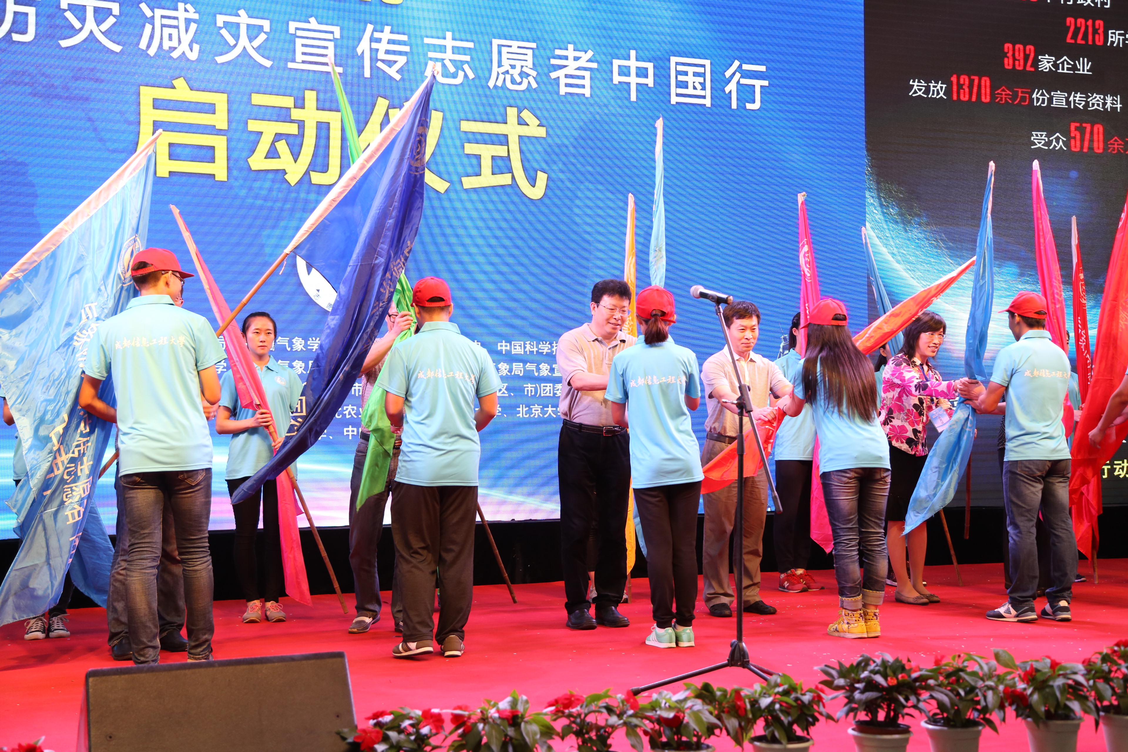 洪兰江宣布“气象防灾减灾宣传志愿者中国行”活动正式启动。启动仪式现场,与会领导向各省志愿者代表授旗,并向2015年气象科普作品小学生拼图比赛获奖的小选手颁奖。全体领导、来宾,老师们、同学们一同观看了“八载风雨兼程,践行责任担当”气象科普文艺表演。