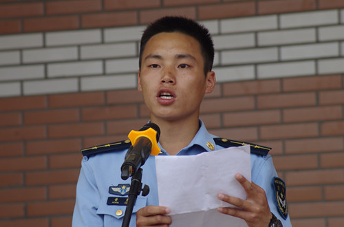 新生代表承诺:2014级全体同学将以昂扬的斗志和饱满的热情投入大学四年的第一堂必修课,尊敬教官、听从指挥、敢于吃苦、认真训练、团结协作,展现青年学子奋发向上的决心和无限的青春活力。
