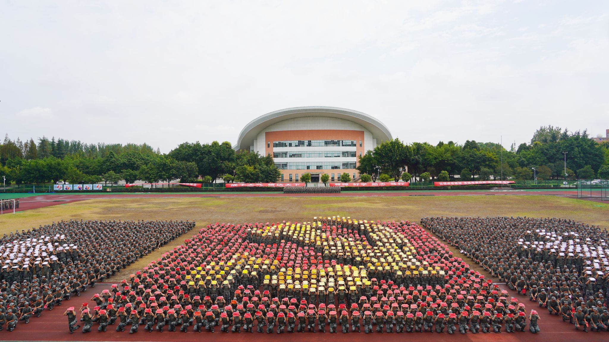 匕首操方队虎虎生威、巾帼不让须眉;军体拳方队整齐划一,酷飒中带着自信,豪迈中带着坚韧;花式方阵栩栩如生地摆出了战斗机造型,展示了学子们敢于创新,力争上游的精神面貌。同学行云流水地变换队列,展示出中国地图和“中国”“强国有我”等美观大气的队形,表达成信学子对祖国的热爱以及锐意进取、追求卓越的精神风貌。
