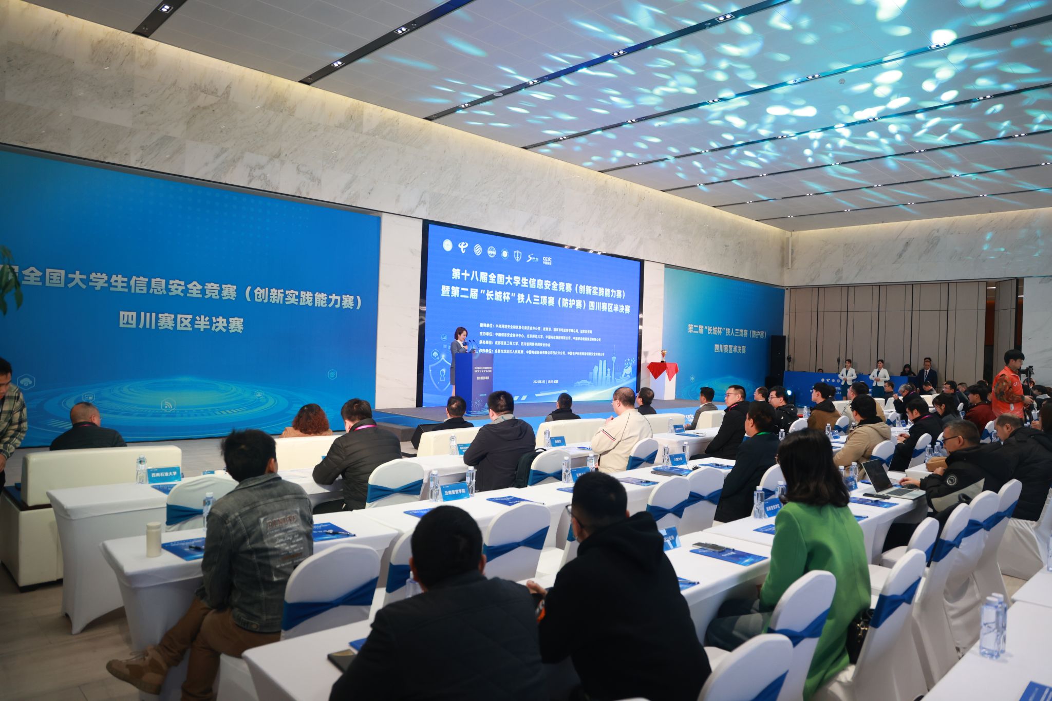学校党委书记沈火明,北京电子科技学院副校长谢四江,中国信息安全测评中心石竑松,中共四川省委网络安全和信息化委员会办公室总工程师何力,成都市双流区人民政府副区长罗臻,成都市保密局总工孙宏海,四川省教育信息化与大数据中心总工程师李锋,四川省公安厅网络安全保卫支队支队长张学谦,四川省大数据中心数据安全处副处长曹霞,成都市相关部门负责人,川内高校网安负责人以及参赛队伍指导老师等120余人出席开幕式。