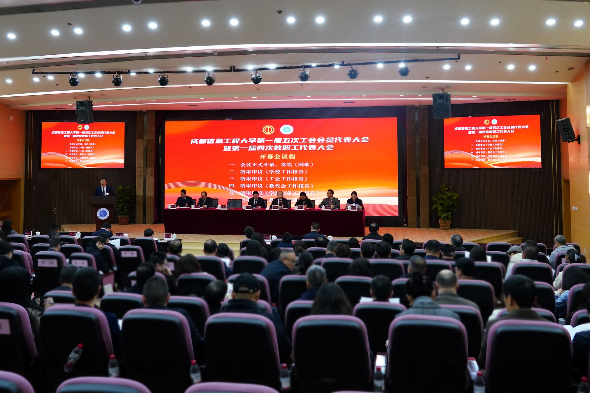 上午,第一届五次工会会员代表大会暨第一届四次教职工代表大会在雄壮的国歌声中开幕。