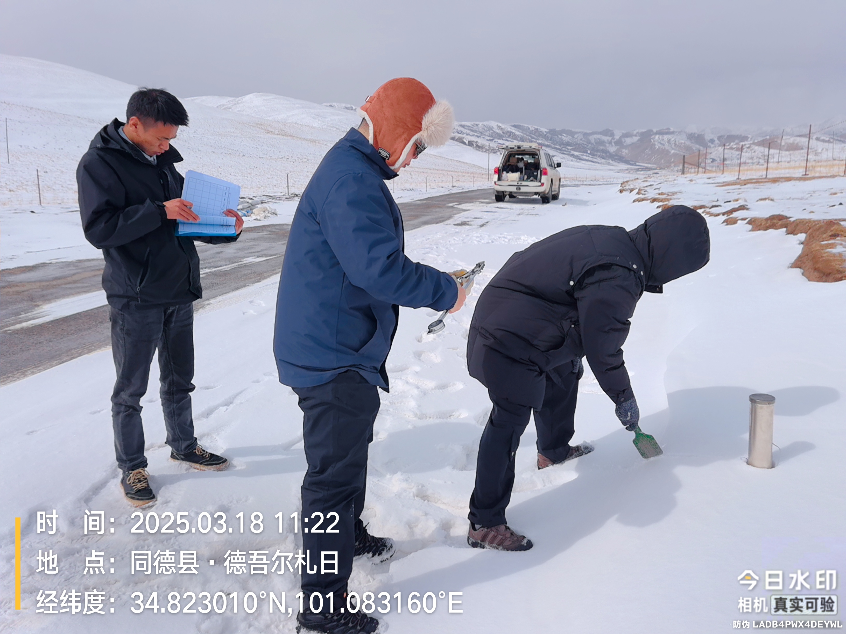 【本网讯】三月的高原,大雪纷飞。我校资源环境学院师生4人,3月16-22日期间历时7天跨越川、甘、青三省,横穿平均海拔4000米的三江源,开展了一次积雪特性与反射光谱的野外调查与观测试验工作。调查自成都出发,由红原、若尔盖进入三江源东缘的甘肃碌曲县,自青海省黄南州河南蒙古族自治县开始,自东向西经由黄河源阿尼玛卿雪山,翻越海拔4800米的巴彦喀拉山,进入长江源区通天河流域,由青海玉树地区沿澜沧江东部流域返蓉。本次野外调查行程逾4000公里,哪里有雪就向哪里出发,克服了道路的艰险,共获取积雪深度、密度、雪水当量样本95个,积雪反射高光谱数据20余条,较圆满地完成了预定考察任务,为三江源地区积雪遥感监测模型本地化优化及准确性提升、以及融雪过程与径流估算等科学研究提供了丰富的第一手数据。