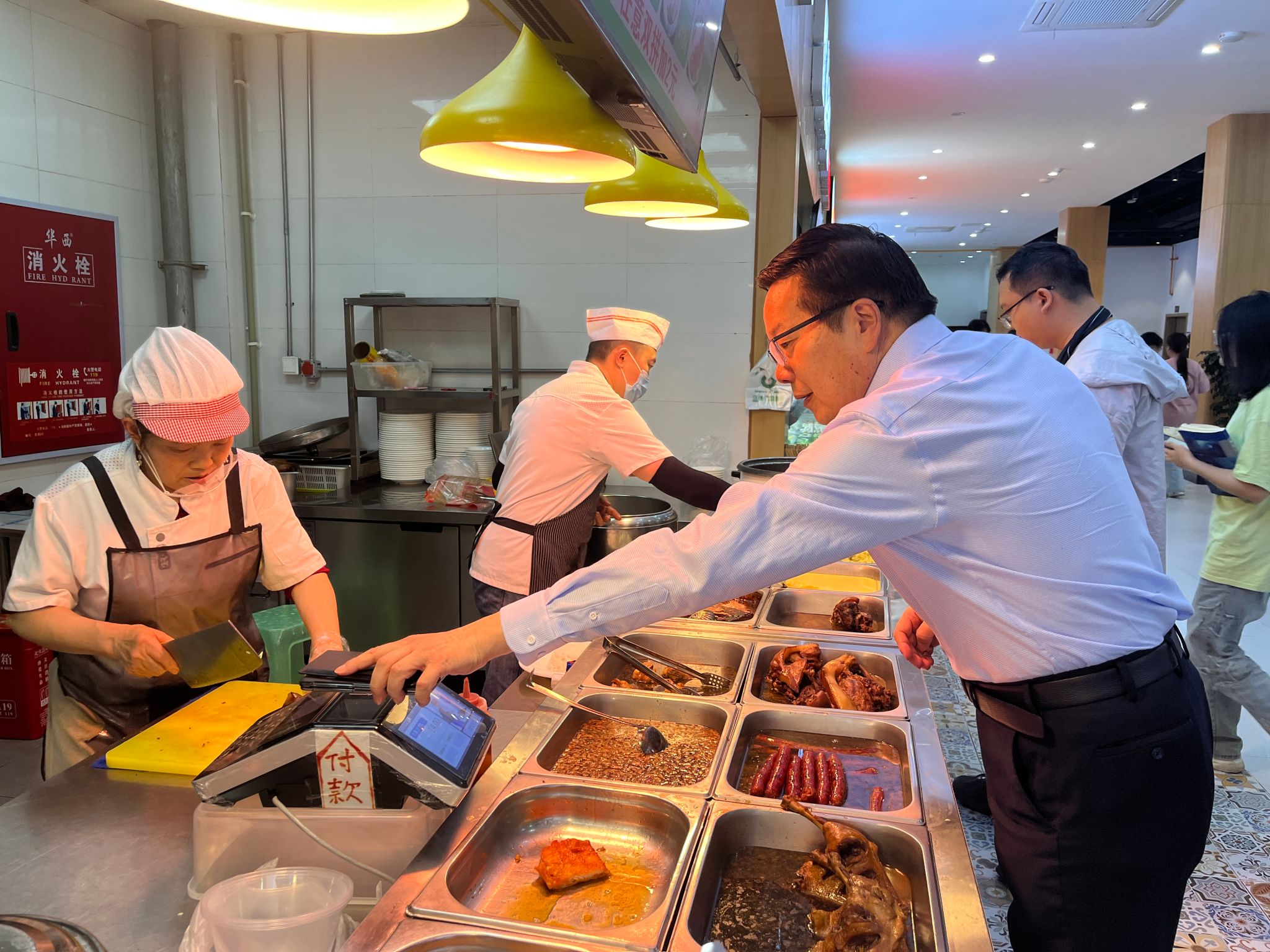 沈火明仔细查看食堂环境卫生、菜品菜价、餐具消毒等情况,并与食堂工作人员亲切交谈,详细了解菜品搭配、档口环境卫生、食品安全保障措施等。