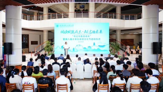 【本网讯】4月23日,“书记与我话成长”暨第八届大学生阅读文化节启动仪式在航空港校区图书馆举行。本次活动以“阅读赋能成长,AI启迪未来”为主题,学校党委书记沈火明,副校长吴锡,相关职能部门负责人,各学院党委书记、副书记和师生代表参会。此次活动由“智学无界·主旨分享”“智慧阅读·创见未来”“智汇交融·聚焦对话” 三个环节构成。
