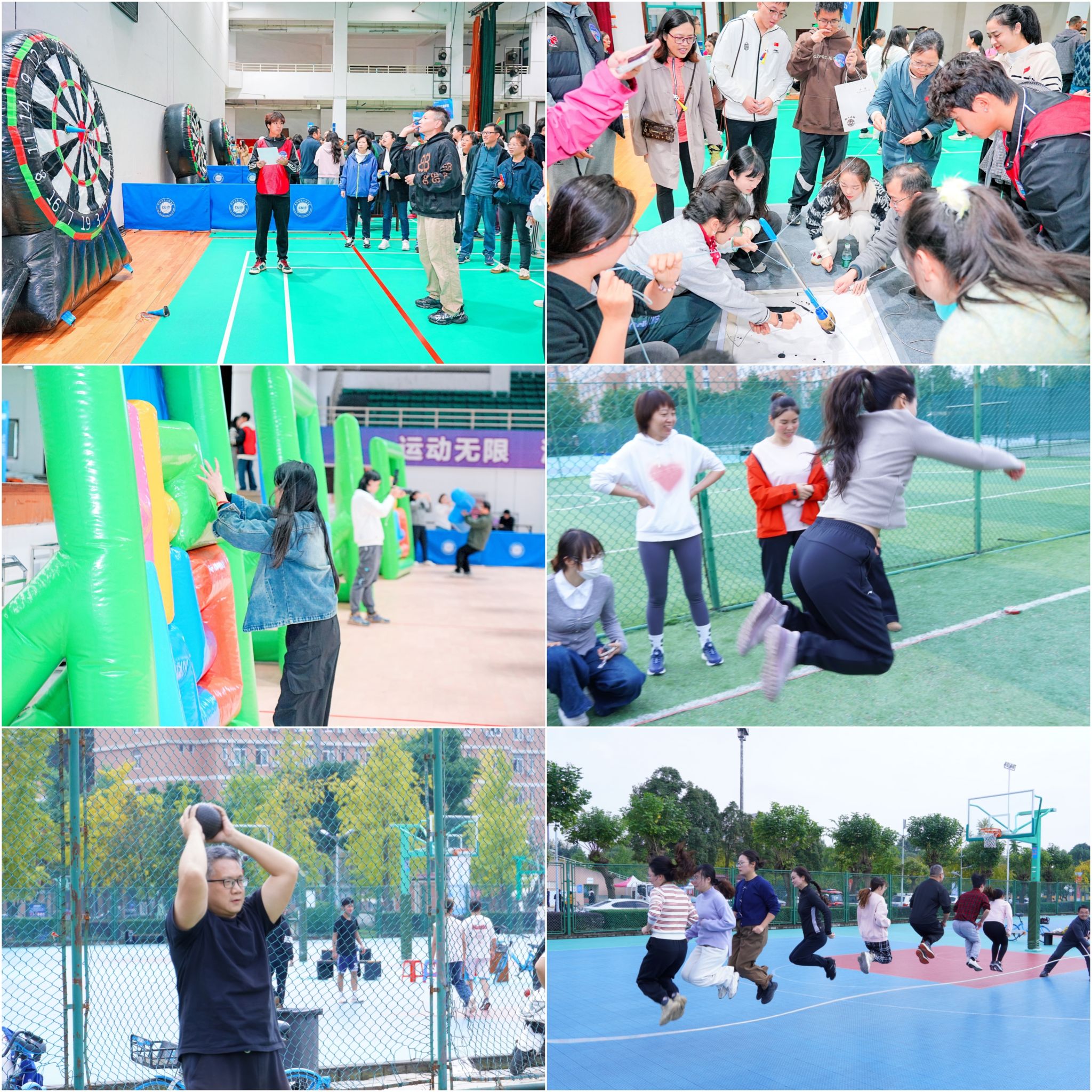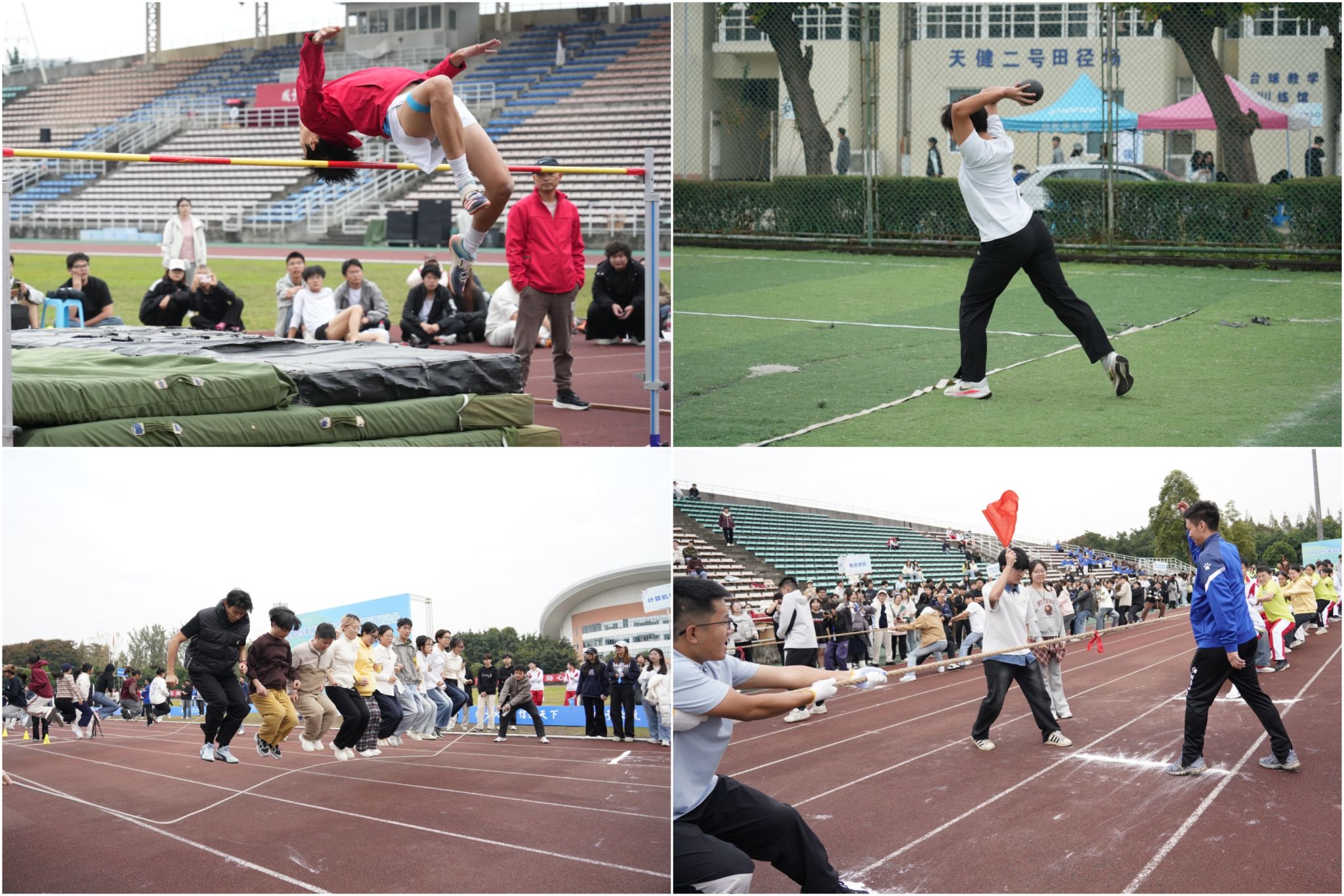 随着发令枪响,运动场瞬间成为激情与活力的海洋。跑道上,运动员如离弦之箭,奋力向前;田赛场中,跳高选手身姿轻盈,一次次挑战新的高度;教工趣味运动会现场同样欢声不断,不同的项目不仅考验技巧,更凝聚了团队默契,展现出教师们课堂之外的别样风采。