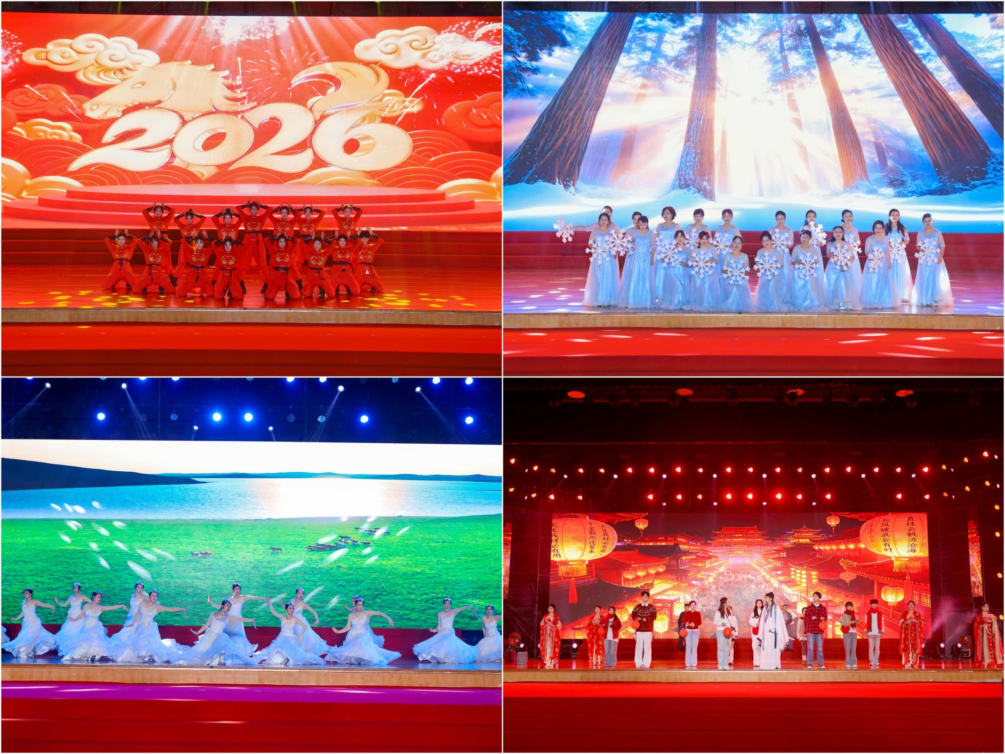 晚会在气势恢宏的器乐合奏《盛世鼓乐》中拉开帷幕,铿锵的鼓点奏响了新年的序曲。晚会由“信韵风华”“同心筑梦”“新程启航”三个篇章组成,15个节目形式多样、精彩纷呈。流行舞《好日子》活力四射,点燃现场气氛;教师合唱《雪花的快乐》清澈悠扬,传递冬日温情;民族舞《额尔古纳河》以刚柔并济的舞姿,演绎出母亲河的辽阔与深沉。情景诗朗诵《蜀韵诗仙行》带领观众穿越千年,领略巴蜀诗风的浪漫豪迈。