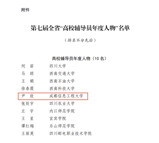 【本网讯】9月7日,全省高校辅导员队伍建设座谈会在成都召开,副省长罗强出席会议并讲话。会上,省委教育工委书记李建勤宣读了《四川省教育厅关于公布第七届全省“高校辅导员年度人物”评选结果的通知》。我校大气科学学院辅导员尹欣获评“高校辅导员年度人物”称号,也是我校连续第二年获此殊荣。