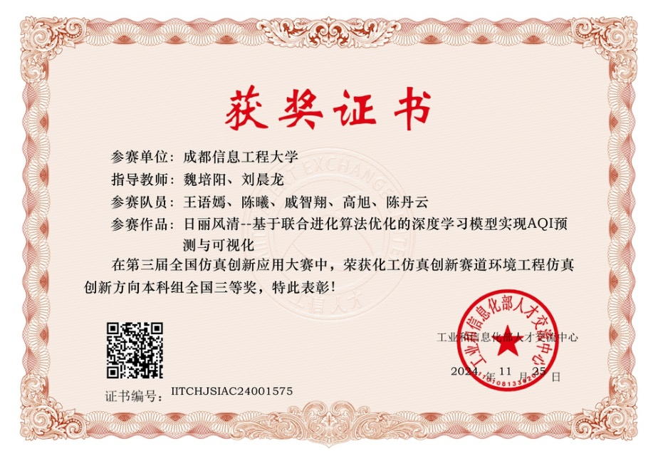 2024年12月,全国仿真创新应用大赛在西安西北工业大学落下帷幕。来自全国422所高校、企业、医学科学单位、军事科学单位及仿真领域的科研院所的1300余支队伍参加比赛。经评审专家初评、参赛团队分组线上答辩、线下仲裁等环节,在“环境工程仿真创新”赛道上最终评选出5件一等奖作品、4件二等奖作品、9件三等奖作品。由我校魏培阳、刘晨龙老师指导,软件工程学院王语嫣、陈曦、戚智翔,通信工程学院高旭,资源环境学院陈丹云等5位同学提交的作品《日丽风清—基于联合进化算法优化的深度学习模型实现AQI预测与可视化》斩获全国三等奖。