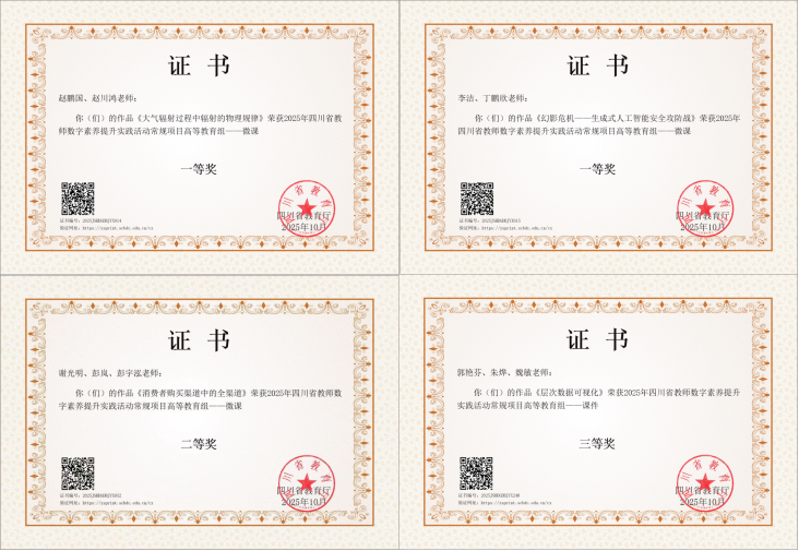 【本网讯】近日,由四川省教育厅主办的2025年四川省教师数字素养提升实践活动获奖名单正式公布。经过教师自评、市(州)及高校推荐、省级专家组严格评审、组委会复核等程序,我校大气科学学院赵鹏国、计算机学院李洁荣获省级一等奖,物流学院谢光明荣获省级二等奖,计算机学院郭艳芬荣获省级三等奖。