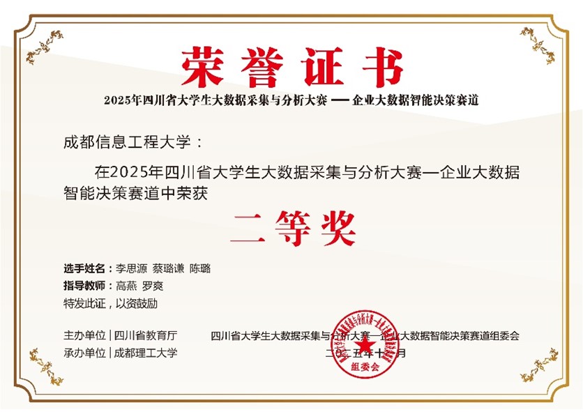 【本网讯】近日,2025年四川省大学生大数据采集与分析大赛——企业大数据智能决策赛道决赛暨颁奖典礼成功举行。本次大赛由四川省教育厅牵头主办、成都理工大学承办,四川省大数据产业联合会、金蝶系企业等多方协办,全省34所高校同台竞技,141支团队、近400名选手围绕企业数据决策展开比拼。我校推送的5支队伍全力以赴,最终在本科组拿下二等奖1项、三等奖4项,取得5支队伍全部获奖的优异成绩。