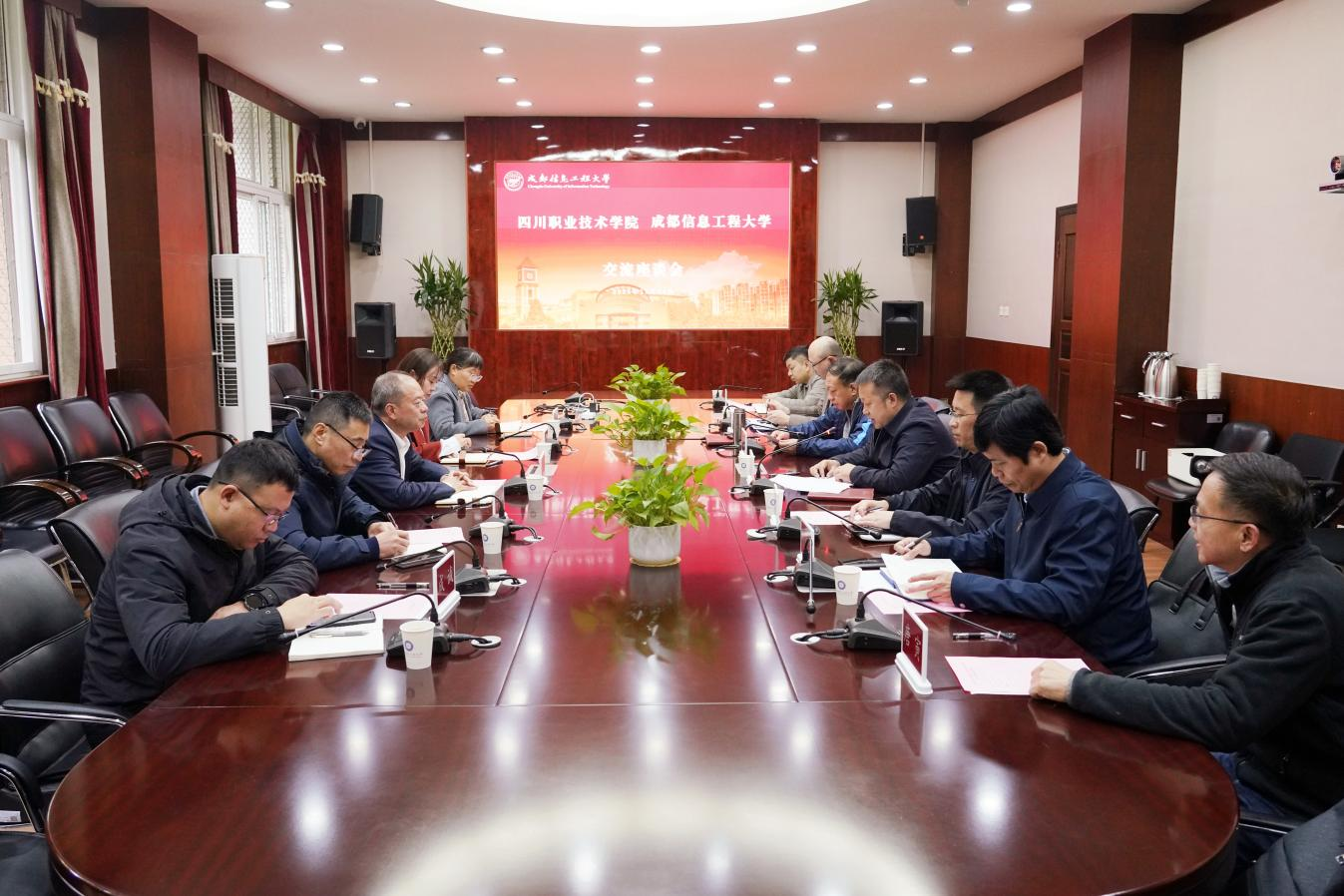【本网讯】11月24日,为深化两校对口共建工作,四川职业技术学院党委书记张生、副校长徐凤一行到我校交流座谈。学校副校长舒红平,党委组织部、国内合作处、教务处、科技处、人工智能学院相关负责人参加座谈。会议由国内合作处处长张斌兵主持。