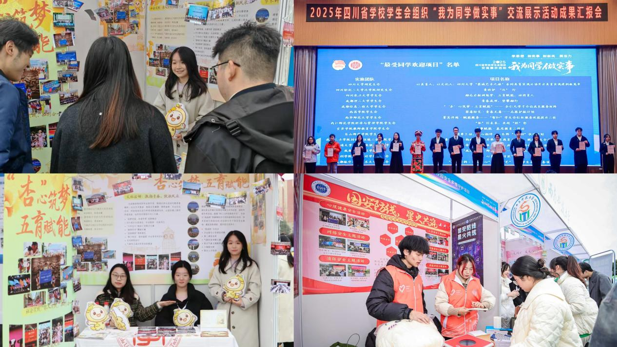 【本网讯】12月14日至15日,2025年四川省学校学生会组织“我为同学做实事”项目交流展示活动在成都举办。经过学校初选推荐、全省初选、同学满意度调查、现场答辩展示四个环节,我校推报项目在全省214所学校381个申报项目中脱颖而出。学校学生会“‘杏’心筑梦·五育赋能”——杏仁儿学子全面成长服务矩阵项目,经学生观察团和大众评审团综合评议,荣获四川省学生会服务同学“最受同学欢迎项目”(全省共30项)。该项目与网络空间安全学院学生会“国安防线,星火共筑”校园安全多维守护项目,也双双入选四川省学生会组织服务同学“百佳项目”(全省共100项)。三项荣誉的取得,集中彰显了我校服务育人的扎实成效。