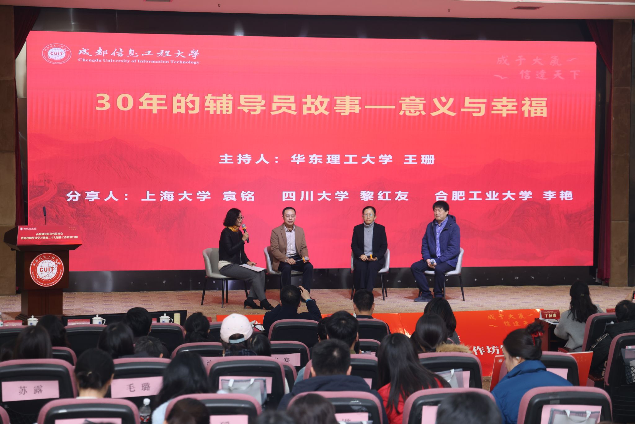 第四阶段题为“5年的辅导员故事——梦想与规划”,由电子科技大学光电科学与工程学院党委副书记李毅主持。山东大学辅导员陈冠廷以“活出有结构的生命”为题,讲述了年轻辅导员从迷茫到坚定的成长历程。武汉大学金旻、华东理工大学高宇、四川财经职业学院胡桑等围绕“梦想与规划”展开对话,展现了新一代辅导员的朝气、思考与担当。