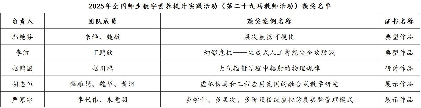 【本网讯】近日,由教育部教育技术与资源发展中心(中央电化教育馆)主办的2025年全国师生数字素养提升实践活动(第二十九届教师活动)圆满结束。我校教师团队获得国家级奖项5项,其中,典型作品2项、研讨作品1项、展示作品2项。