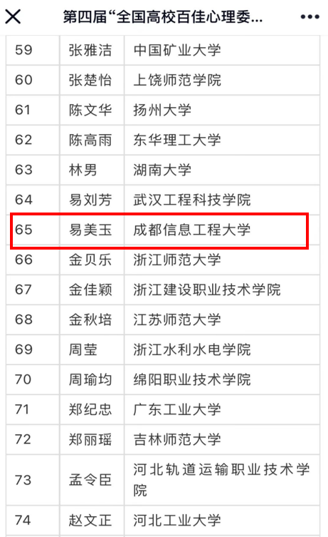 【本网讯】近日,由中国心理学会心理危机干预工作委员会、全国高校心理委员研究协作组主办的第十六届全国高校心理委员工作研讨会暨朋辈心理辅导论坛以线上直播的方式举行。会上公布了第四届“全国百佳心理委员”评选结果,我校大气科学学院袁晓雯同学荣获“全国百佳心理委员”称号,管理学院易美玉同学荣获“全国百佳心理委员提名奖”。