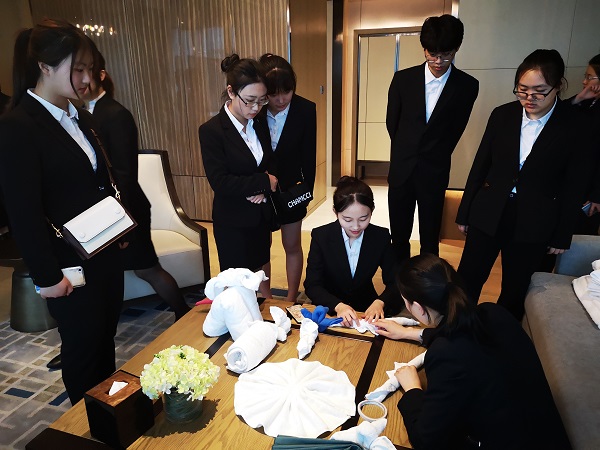 在酒店工作人员的带领下,同学们分两组参观了酒店大堂、副总统套房、中餐厅、行政楼层、健身房、水疗中心、自助餐厅和员工区域,并在酒店工作人员的协助下参与酒店毛巾叠花等体验活动。
