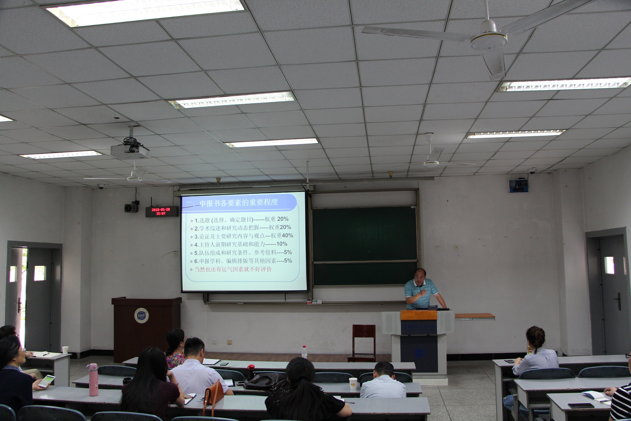 罗建文从人才队伍建设、学科建设及其与马克思主义学院建设之间的重要性进行了深入分析和探讨,对我校马克思主义学院的建设起到了重要指引作用。他主要围绕国家社科基金项目申报书的组成要素及其权重比例、申报书的填写以及科研项目的培育准备等方面做了深入而全面的阐述。他结合自己申报各类项目的经历,和近年来担任国家社科基金项目通信评审专家的经验,就申报书的各个要素和各个部分内容要求,以及注意事项等方面做了详细的讲解和分析,受到了与会老师的好评。在场的广大教师纷纷表示获益颇丰,对自己日后的科研工作,有积极地引领作用。