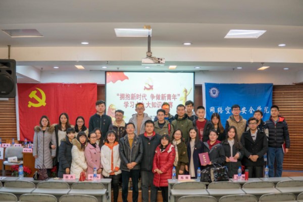 【本网讯】为深入学习贯彻党的十九大精神、深入推进“两学一做”学习教育常态化,2017年12月19日晚,由网络空间安全学院党总支主办,网络空间安全学院学生党支部、网络空间安全学院团委协办的“拥抱新时代 争做新青年”------深入学习党的十九大知识竞赛决赛在我校学术报告厅举办。网络空间安全学院党总支书记陈麟,总支所有委员、各支部书记、委员、辅导员、全体学生党员、积极分子参加了本次活动。