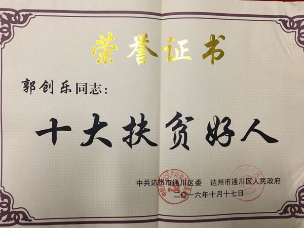 【本网讯】近日,根据中共达州市通川区委、通川区人民政府《关于开展2016年度脱贫攻坚先进集体和个人评选活动的通知》,经通川区脱贫攻坚领导小组评审,我校挂职教师郭创乐荣获达州市通川区”十大扶贫好人”称号。