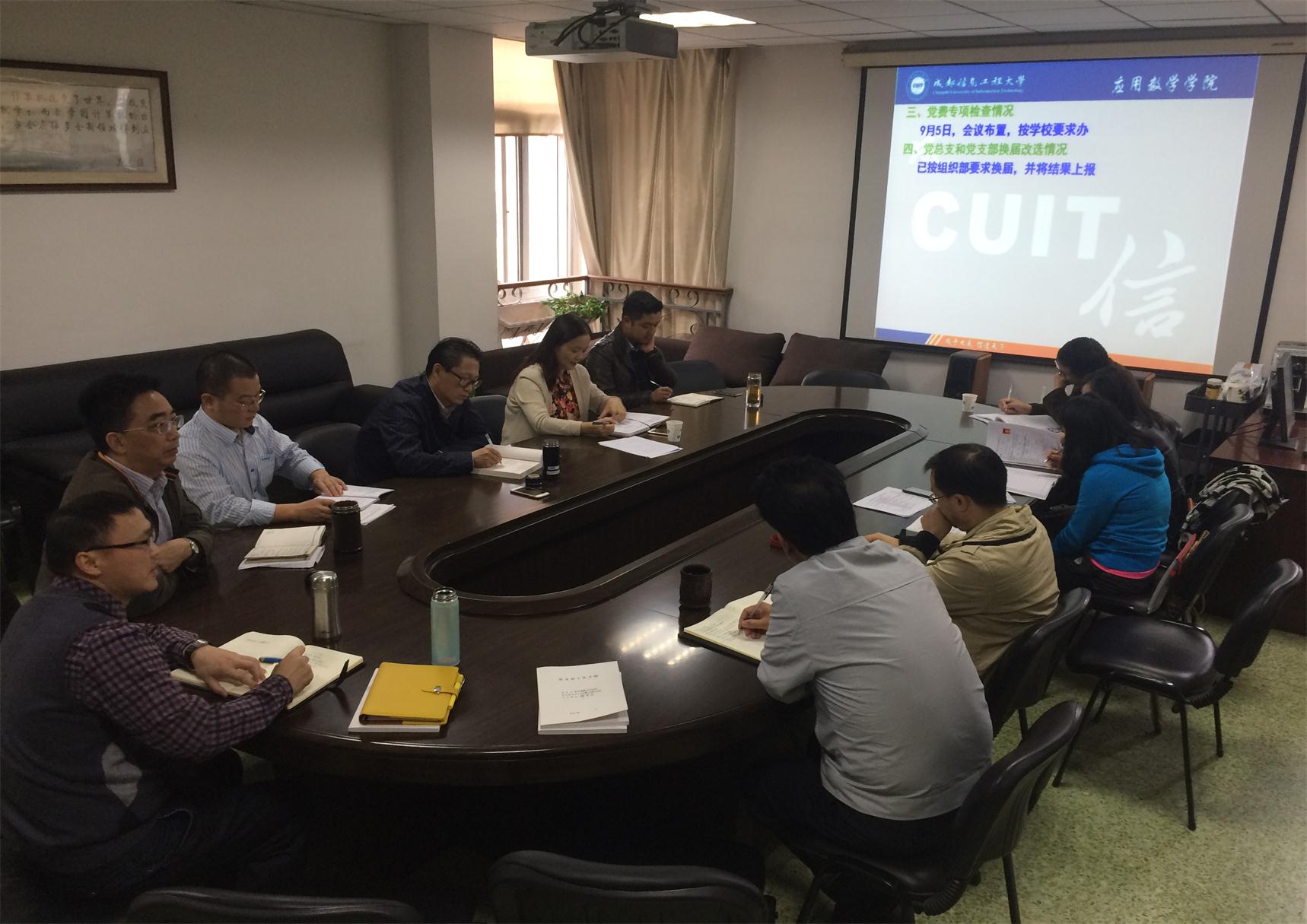 应用数学学院党总支杨光崇书记汇报了学院党总支7-9月开展“两学一做”学习教育的总体情况,主要结合上级党委要求的重要督导事项,从“总结前期经验,及时整改问题”、 “专题学习情况”、 “党费专项检查情况”、“党总支和党支部换届改选情况”、“领导干部双重组织生活制度落实情况”、“党员合格标准讨论情况”,“建立长效机制,落实党员活动日”、“党支部工作手册”、“一卡一表”九个方面,汇报了一系列工作的做法和成效。