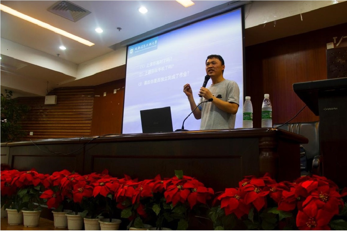 【本网讯】 为深入推动“两学一做”学习教育,在学校的统一安排下,6月24日,通信工程学院邀请应用数学学院吴泽忠教授在学术报告厅开展了以“示范引导,勇于担当”为主题的“两学一做”专题讲座。党总支书记刘绍全、全体教师党员和学生党员参加讲座。