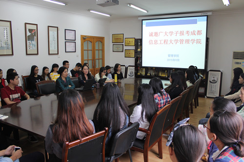 首先黄萍向与会学生详细介绍了我校学科专业建设以及研究生导师队伍和教学、科研平台情况,并介绍了管理学院管理科学与工程硕士点下设方向灾害管理工程、项目管理、信息管理与信息系统、行为科学决策理论与方法和农业推广硕士下设领域农业科技组织与服务招收防灾减灾与应急管理、公共气象服务管理、休闲农业与乡村旅游、农村人力资源管理、农村公共服务管理研究方向的具体情况。同时,对我校研究生招生简章和新出台的研究生奖助政策进行了分享。与会人员分享了“为什么考研”和考研的益处,以及如何进行考研方向及学校的选择,考研的心态和思想准备。