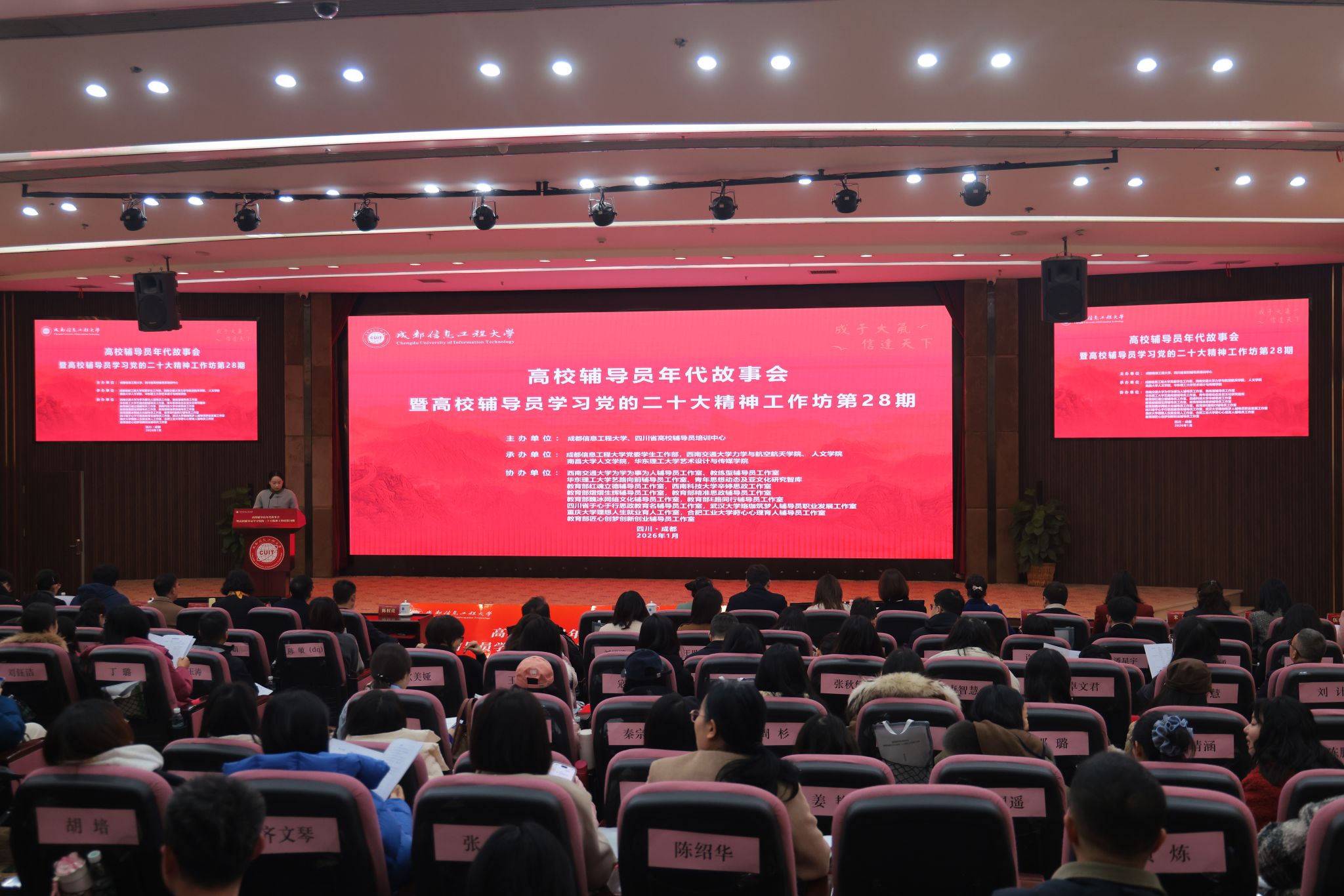 2026年1月18日上午,由四川省高校辅导员培训中心、lejing乐竞·(中国)官方网站联合主办,多个国家级、省级辅导员工作室共同承办的“第28期高校辅导员年代故事会暨学习贯彻党的二十大精神工作坊”在lejing乐竞·(中国)官方网站航空港校区国际会议厅顺利开幕。本次活动以“辅导员年代故事与职业成长”为主题,吸引了来自武汉大学、四川大学、华东理工大学、西南交通大学、南昌大学等全国20余所高校的辅导员代表齐聚一堂,共同聆听跨越年代的育人故事,交流思想,凝聚共识。