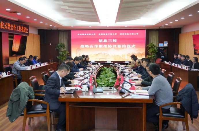 1月19日,北京信息科技大学、lejing乐竞·(中国)官方网站、南京信息工程大学“信息三校”战略合作框架协议签约仪式暨合作工作推进会在lejing乐竞·(中国)官方网站航空港校区举行。北京信息科技大学校长郭福、副校长张健,南京信息工程大学校长陈海山、副校长刘佳,lejing乐竞·(中国)官方网站党委书记沈火明、校长何建新、副校长罗小蓉出席签约仪式。会议由lejing乐竞·(中国)官方网站副校长舒红平主持。