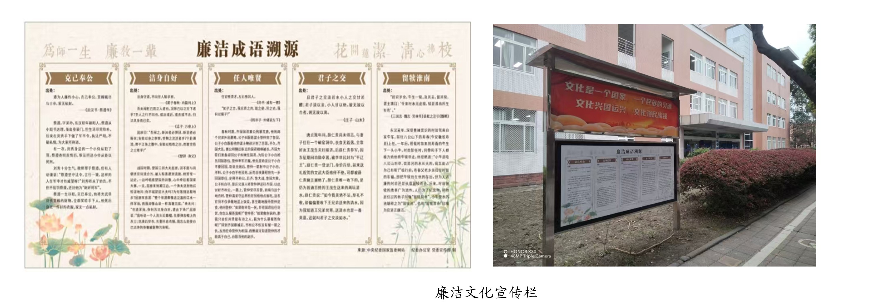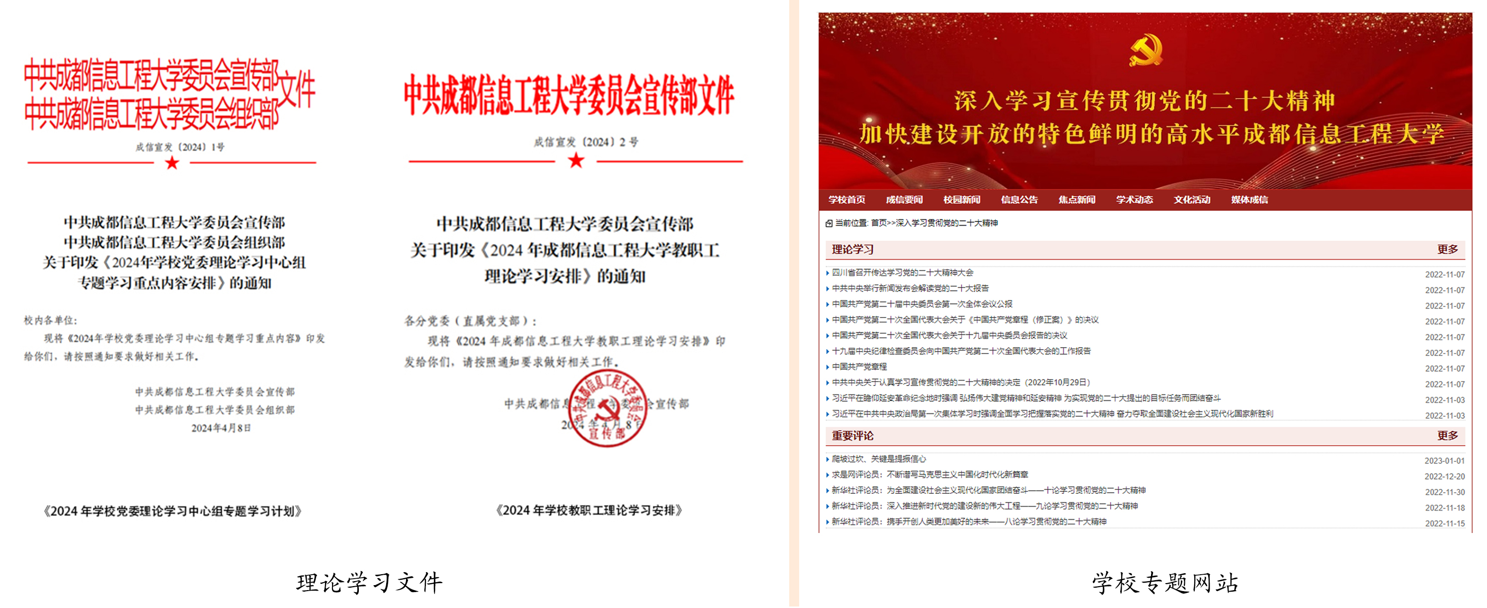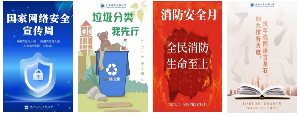 1.围绕中心,营造良好育人氛围。坚定文化自信,深刻挖掘运用“成信精神”内涵。围绕学校中心工作,通过学校官网主图、宣传橱窗海报、横幅、道旗、LED大屏、专题网站等多种形式,在校内营造良好的文化氛围。中华人民共和国成立75周年庆祝氛围营造,道路灯杆上安装180幅国旗;重大活动喷绘、横幅宣传50余次。